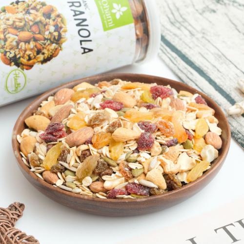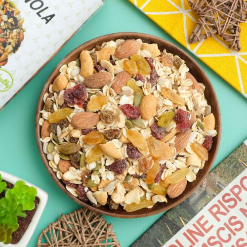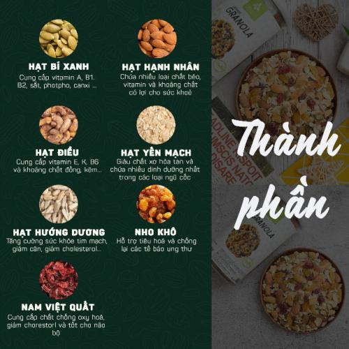Với sự kết hợp từ các loại hạt giàu dinh dưỡng như hạnh nhân, hạt điều, hạt bí xanh, óc chó đỏ, dừa khô, nho khô, yến mạch,…
