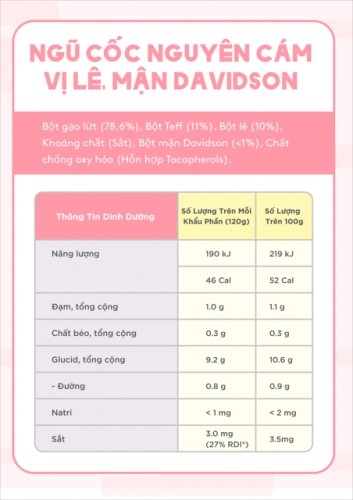 Được sản xuất trên thiết bị xử lý hạt cây, gluten, đậu nành, trứng, hạt vừng, sữa và sulphite. Khuyến nghị không nên dùng cho trẻ dưới 4 tháng tuổi