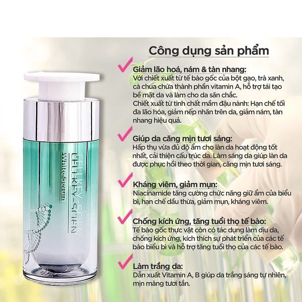 Giảm lão hoá, nám & tàn nhang: Với chiết xuất từ tế bào gốc của bột gạo, trà xanh, cà chua chứa thành phần vitamin A, hỗ trợ tái tạo bề mặt da và làm cho da săn chắc. Chiết xuất từ tinh chất mầm đậu nành: Hạn chế tối đa lão hóa, giảm nếp nhăn trên da, giảm nám, tàn nhang.