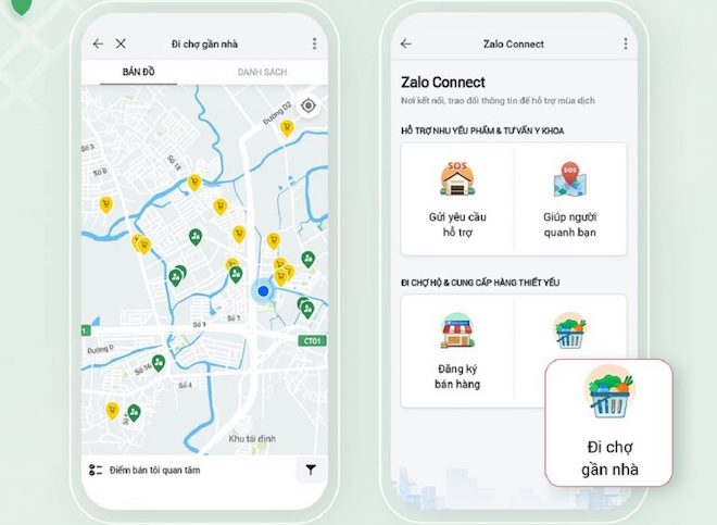 Trước bối cảnh giãn cách nghiêm ngặt và nhu cầu về lương thực, thực phẩm tăng cao, Zalo Connect đã bổ sung chức năng “Đi chợ gần nhà”. Lúc này, ngay tại nơi sinh sống, người dân sẽ tìm được những nhà cung cấp từ rau củ, thực phẩm đến thuốc men,…